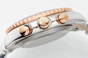The crown is made of eternal rose gold and steel, screw-in type, triple lock triple waterproof system